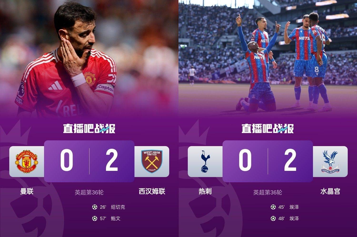 直播吧05月12日讯 英超第36轮,曼联0-2西汉姆,热刺0-2水晶宫。两队双双输球,积分不变但排名下滑至16/17名,仅高于降级区。